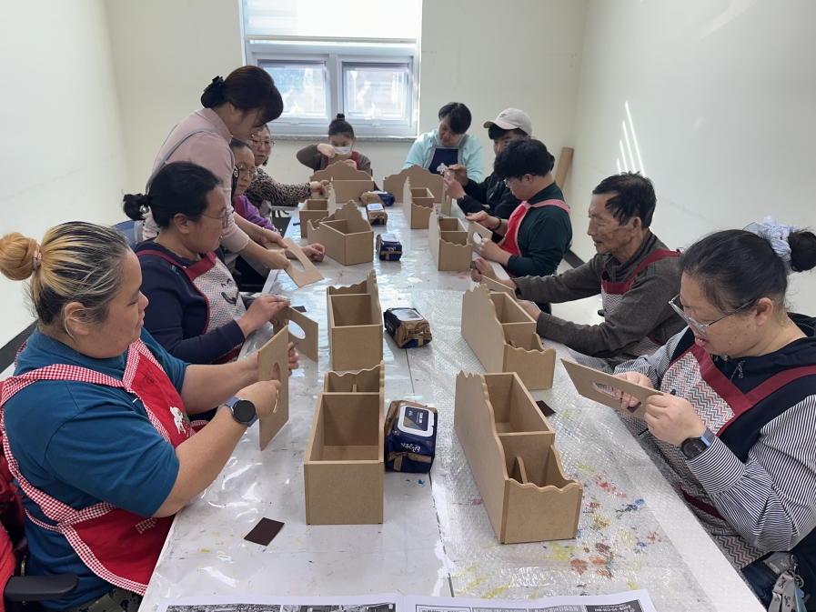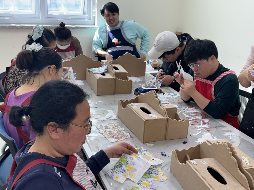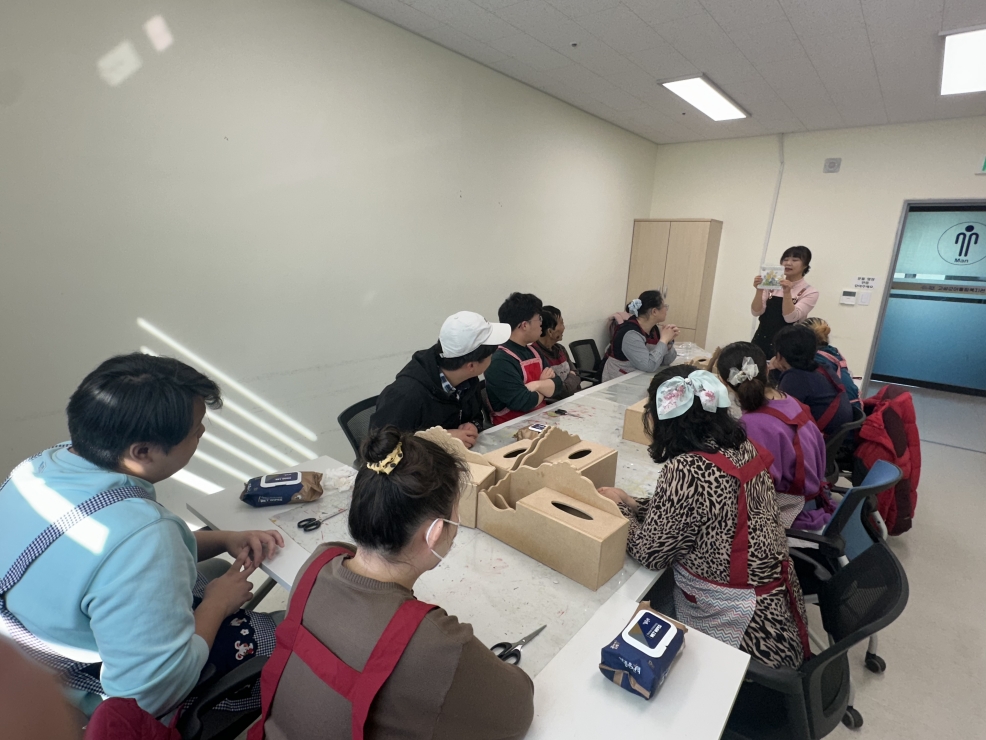 2026.03.04. 공예 프로그램을 시작하여 간단한 자기소개 후 바로 엔틱 티슈함 초벌 작업을 하였습니다.